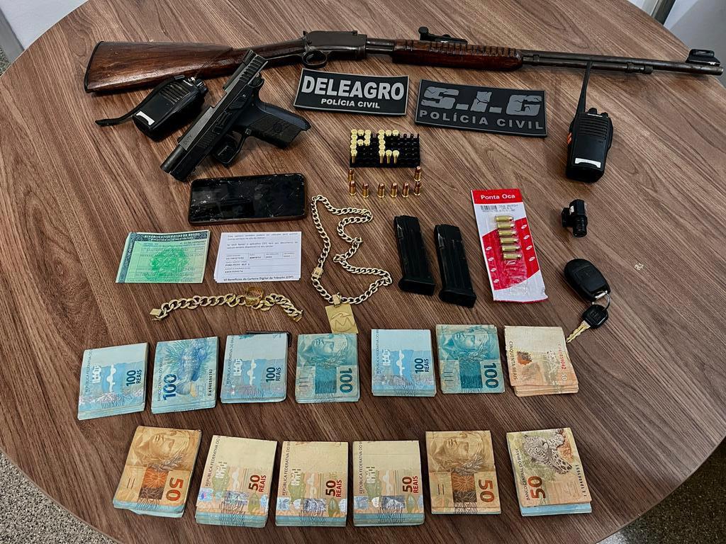 Na manhã do dia 04 de agosto de 2023 a DELEAGRO deflagrou operação visando combater crimes de abigeato na região de Três Lagoas. Com apoio do SIG de Três Lagoas, foi dado cumprimento a quatro mandados de busca e apreensão domiciliar expedidos em decorrência de investigação de abigeato de mais de 100 cabeças de gado. Em uma propriedade rural foi preso em flagrante por porte de arma de fogo de uso restrito um homem, já indiciado pelo furto das reses, que possuía em sua propriedade uma espingarda calibre .22 e uma pistola calibre 380 com numeração suprimida e 33 munições de calibre 380. Além disso foi apreendido mais de R$12.000,00 em espécie sem comprovação de origem e outros objetos de interesse da investigação. Após encerradas as buscas, o indivíduo foi conduzido à Delegacia de Polícia e apresentado à Autoridade Policial para a lavratura de Auto de Prisão em Flagrante Delito.