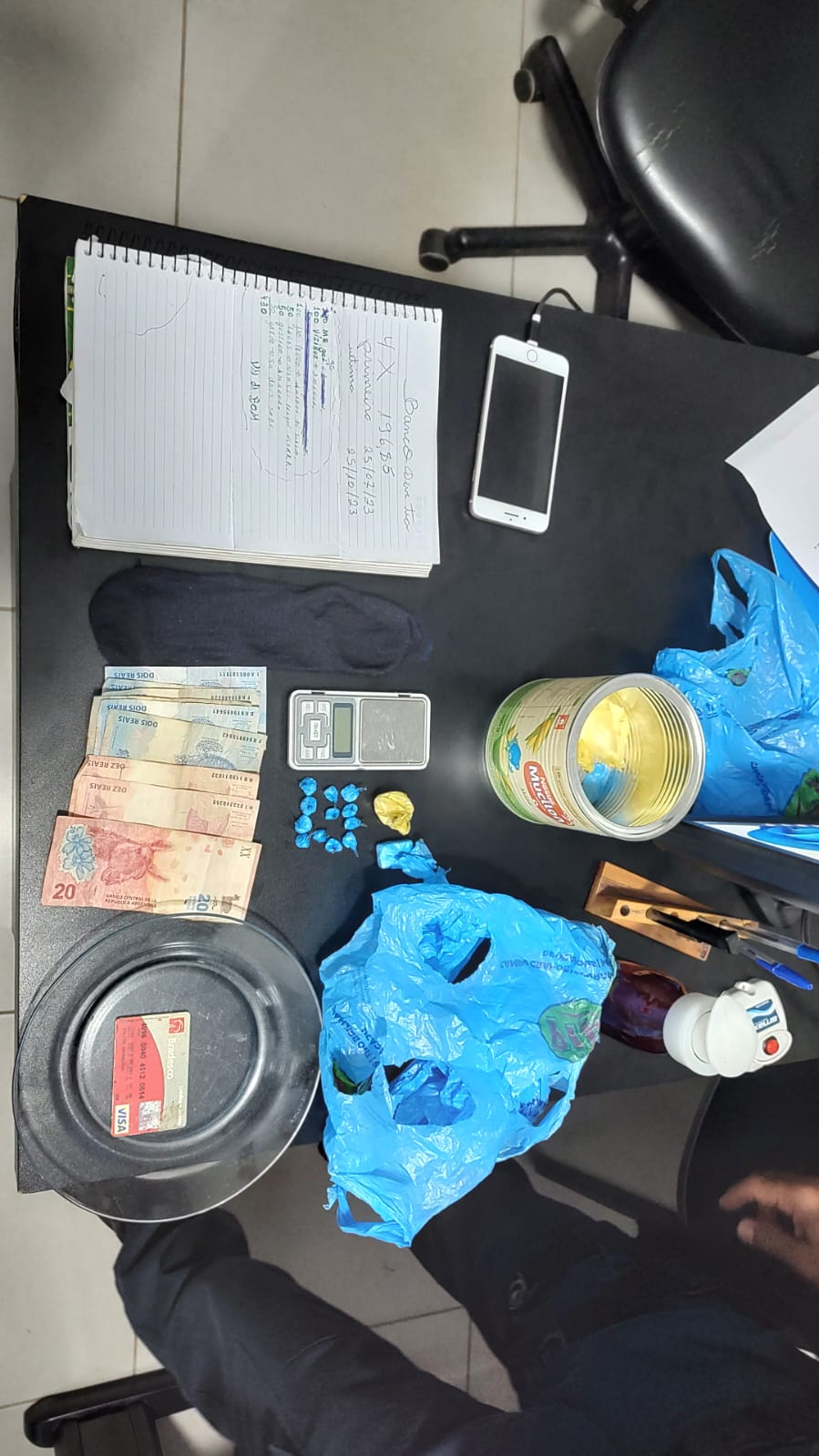 Com ele os policiais apreenderam 14 trouxinhas do entorpecente, um aparelho celular contendo o vídeo divulgado na rede social, um caderno com anotações sobre as vendas, um cartão de banco utilizado para manusear a substância, pedaços de sacolas para embalar a droga, uma balança de precisão e um prato de vidro utilizados para pesagem, além de R$ 32,00 e 20 pesos argentinos.