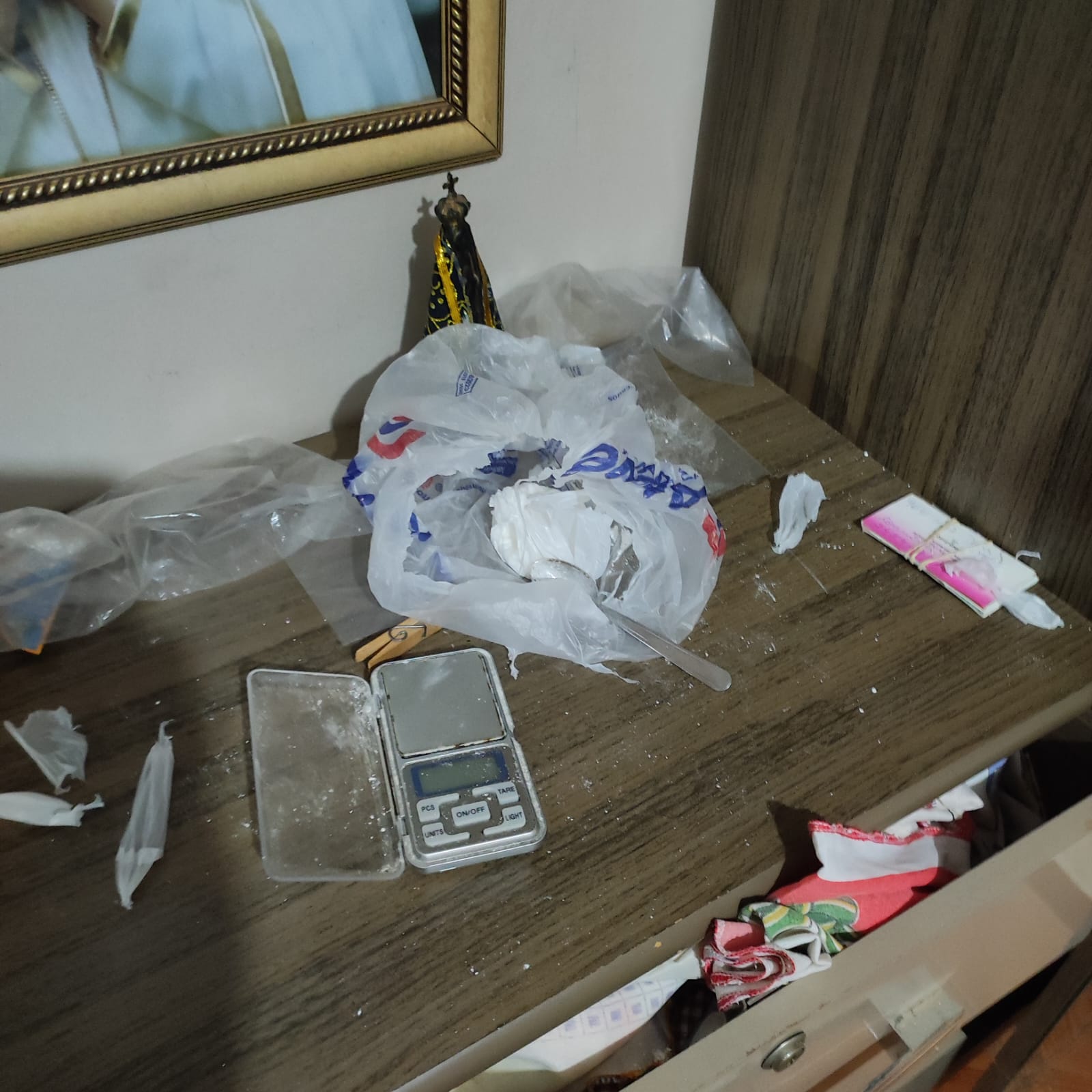 Na residência foram apreendidas 80 porções de cocaína, porções de maconha e três caixas de anabolizante estrangeiro, do tipo Durateston, além de dinheiro, duas balanças de precisão com resquícios de drogas e celulares novos na caixa, prontos para revenda.