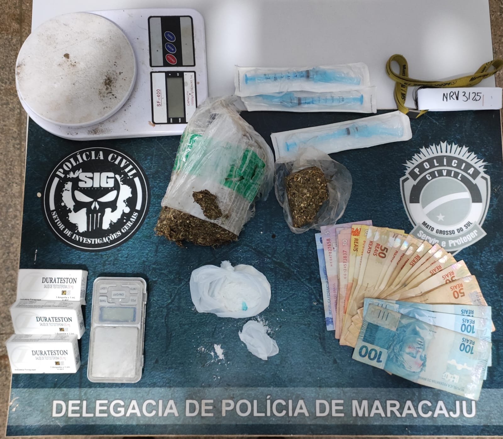 Durante o cumprimento de um mandado de busca domiciliar, nesta sexta-feira, 20/10, a Polícia Civil prendeu um homem em flagrante, por armazenar cocaína, maconha e anabolizantes estrangeiros. A prisão foi feita por uma equipe da Delegacia de Maracaju-MS, no bairro BNH.