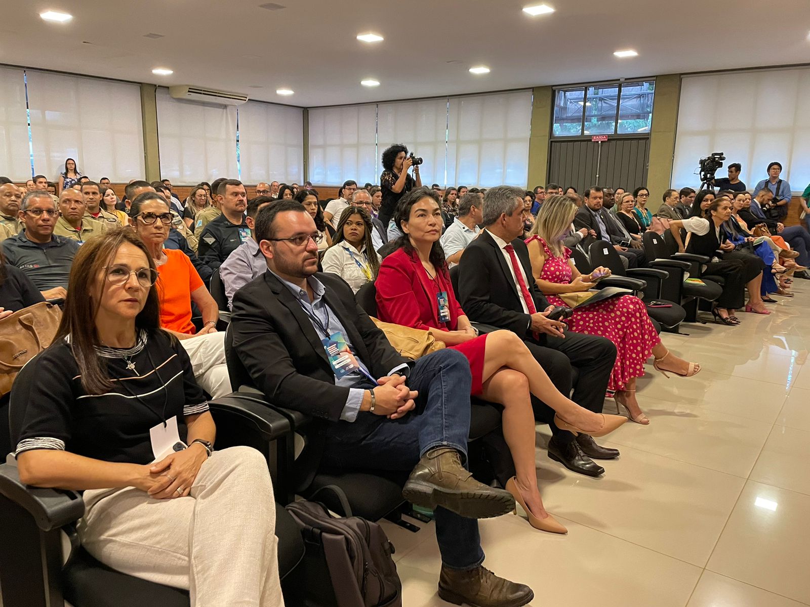 O Delegado-Geral, Roberto Gurgel de Oliveira Filho, participou, nesta terça-feira, 24/10, da abertura do 1º Workshop do Projeto Acolhida, da Secretaria de Justiça e Segurança Pública (SEJUSP), que é uma iniciativa voltada às vítimas indiretas (familiares) de feminicídios e homicídios dolosos. O evento aconteceu no auditório da Academia de Polícia Civil (Acadepol), com a presença de diversas autoridades civis e militares, dentre elas, o Secretário de Justiça e Segurança Pública, Antonio Carlos Videira.