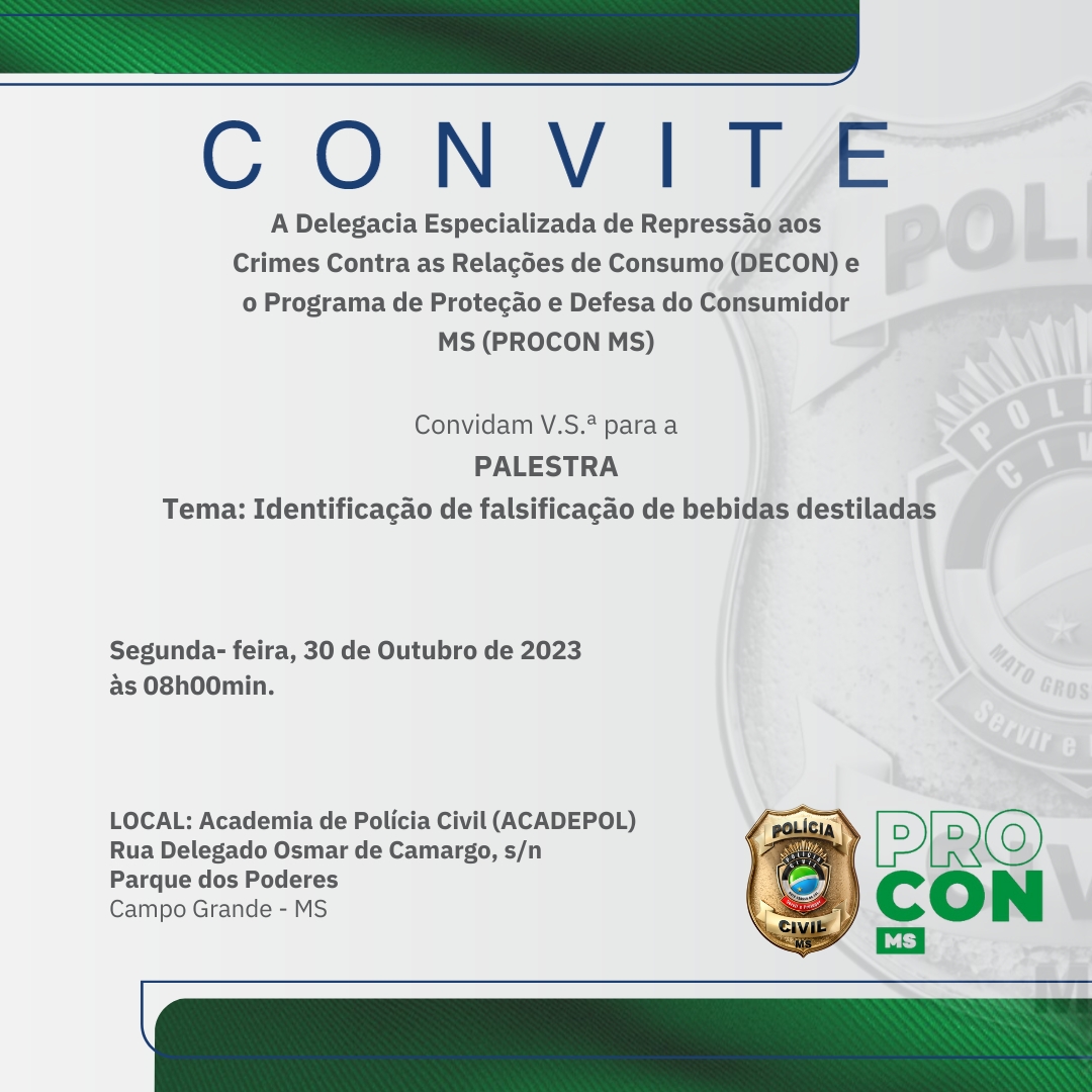 É com grande satisfação que a Delegacia Especializada de Repressão aos Crimes Contra as Relações de Consumo (DECON) e o Programa de Proteção e Defesa do Consumidor MS (PROCON MS) convidam todos os policiais civis para uma palestra: