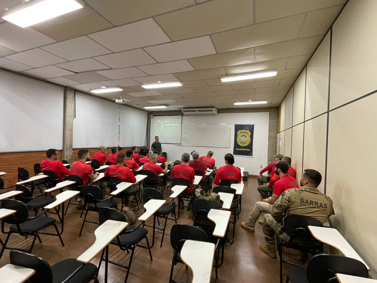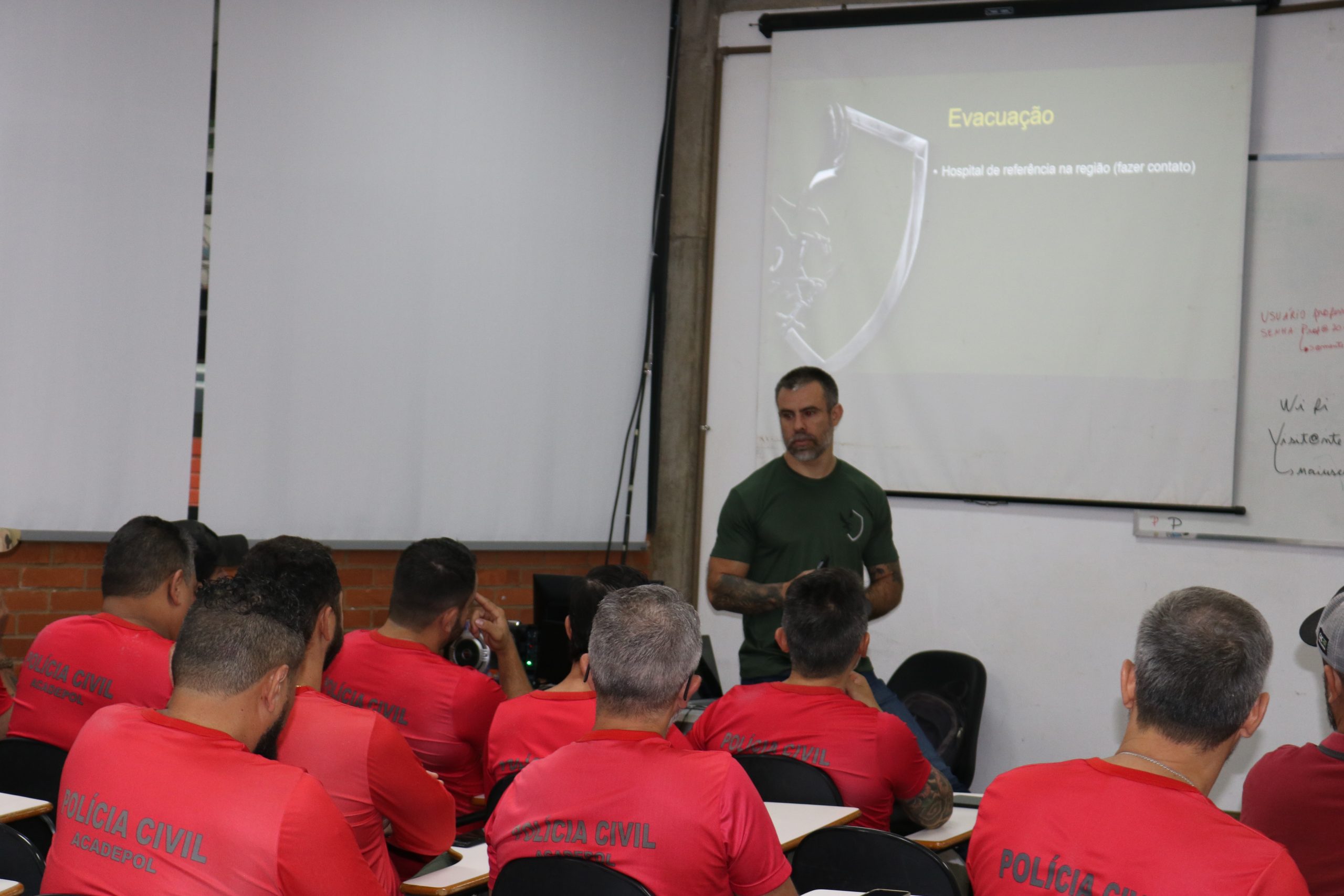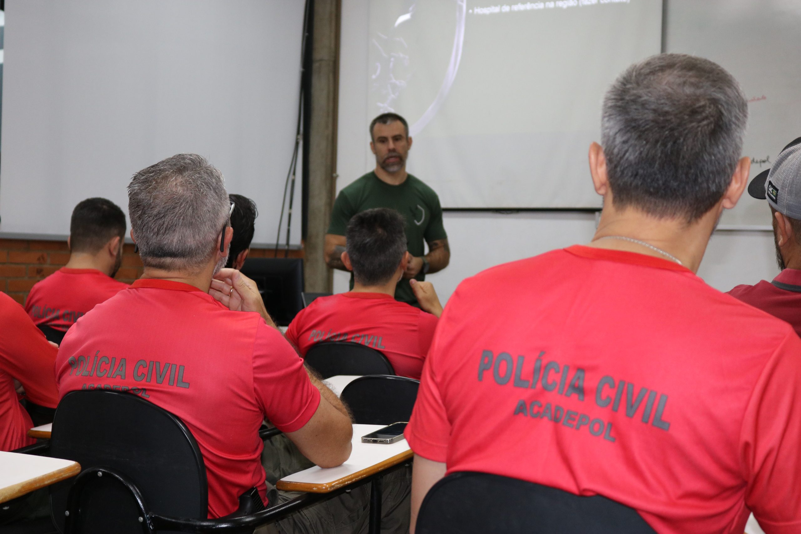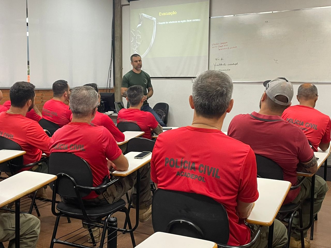 Com o objetivo de criar protocolos e nivelar todo o corpo de instrutores de tiro da Academia de Polícia Civil do Mato Grosso do Sul (Acadepol/MS) em relação ao que fazer caso haja alguma intercorrência envolvendo disparo de arma de fogo, teve início na manhã desta terça-feira, 05/12, o curso de Atendimento Pré-Hospitalar. O treinamento se destina aos professores e auxiliares da disciplina de armamento, munição e tiro, que ministram aulas na Acadepol.