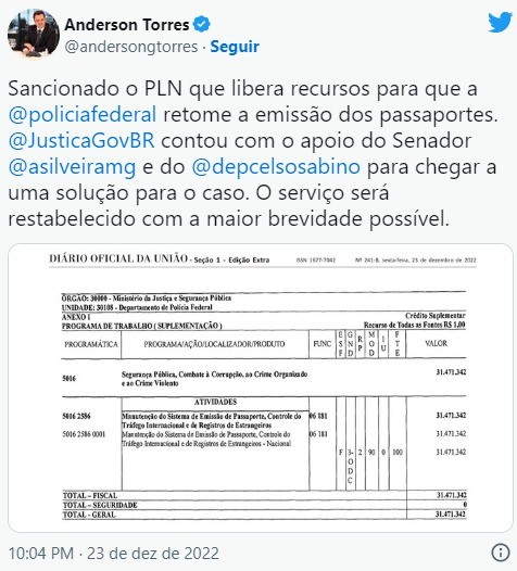O ministro da Justiça, Anderson Torres, publicou no Twitter a matéria orçamentária que mostra a liberação do recurso à Polícia Federal (PF) para o retorno das emissões de passaporte. Na divulgação, Torres diz que o serviço será restabelecido o mais breve possível.