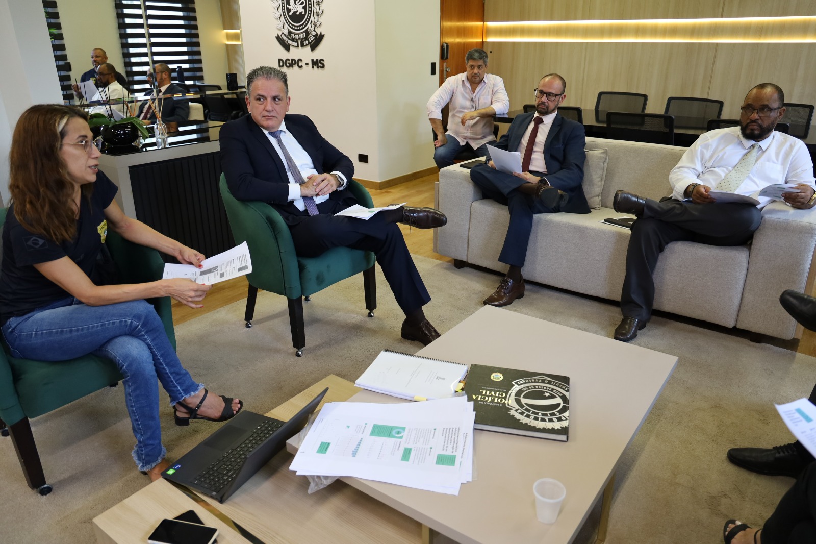 Nesta quinta-feira (19), o Delegado-Geral da Polícia Civil do Mato Grosso do Sul, Lupérsio Degerone Lucio, recebeu em seu gabinete, o diretor do Departamento de Gestão de Pessoas/Coordenadoria de Atendimento Psicossocial e Espiritual da Polícia Civil (DGP/CAPE) – delegado Nilson Fonseca Martins e o coordenador Antenor Batista da Silva Júnior, para a apresentação do planejamento de trabalho do departamento para o ano de 2025, que terá como foco a melhoria do atendimento a todos os policiais civis. Também participaram da reunião o Delegado-Geral Adjunto Márcio Custódio, o Assessor de Relações Institucionais e de Comunicação – delegado Fabiano Nagata, a gestora de ações sociais – Patrícia Alencar e o investigador André Rodrigues.