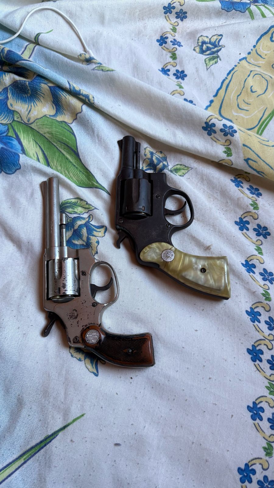 Após registro dos fatos, uma equipe diligenciou a residência do casal. O autor foi encontrado no interior da residência na posse de duas armas de fogo tipo revolver, onde ambas estavam municiadas com 8 munições intactas.