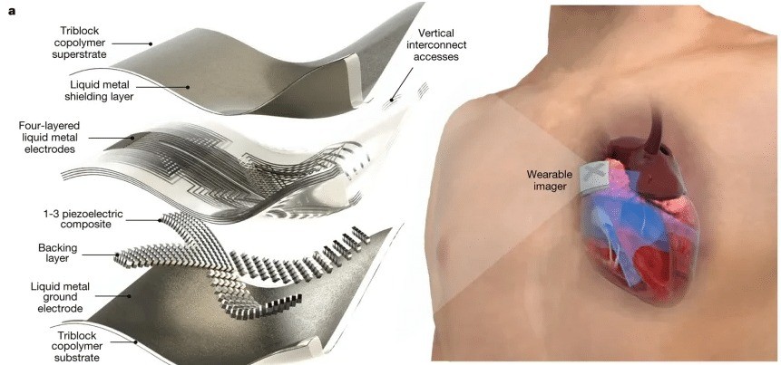 O equipamento usa transdutores piezoelétricos (ou seja, movidos a pressão) para realizar imagens de tecidos profundos. Eletrodos de metal líquido extensíveis dão suporte ao gerador de imagens de ultrassom, garantindo que o dispositivo permaneça próximo à pele. Conforme divulgado pelo tabloide Engadget, projetos anteriores de ultrassons vestíveis eram limitados no que diz respeito ao design, o que a nova versão consegue contornar.
