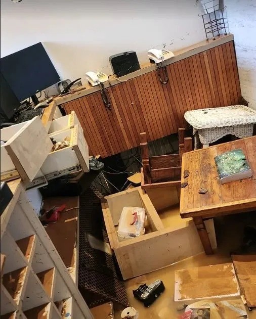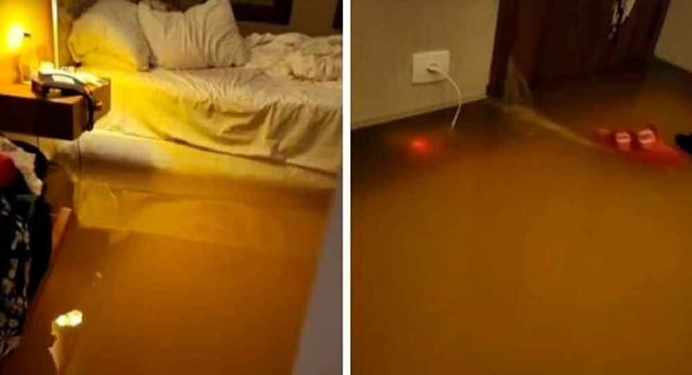 Pelas imagens, é possível observar a água subindo e ultrapassando a altura do pé da cama e de alguns móveis. “Não sei como consegui jogar as malas para cima do armário”, escreveu, mostrando a água cobrindo os pés.