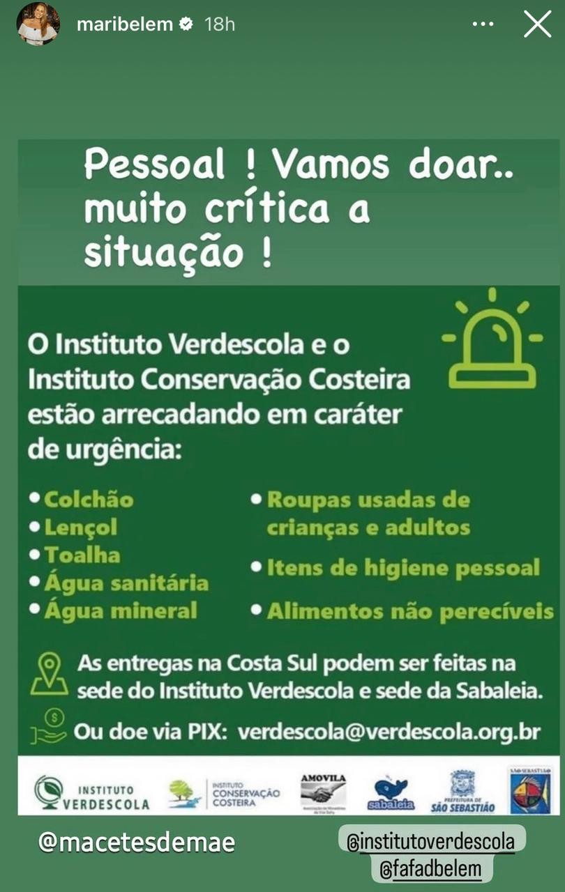 Mariana pediu ajuda aos desabrigados de São Sebastião. "Pessoal! Vamos doar..muito crítica a situação", publicou em seus stories no Instagram, onde deixou o pix do Instituto Verdescola para doações.