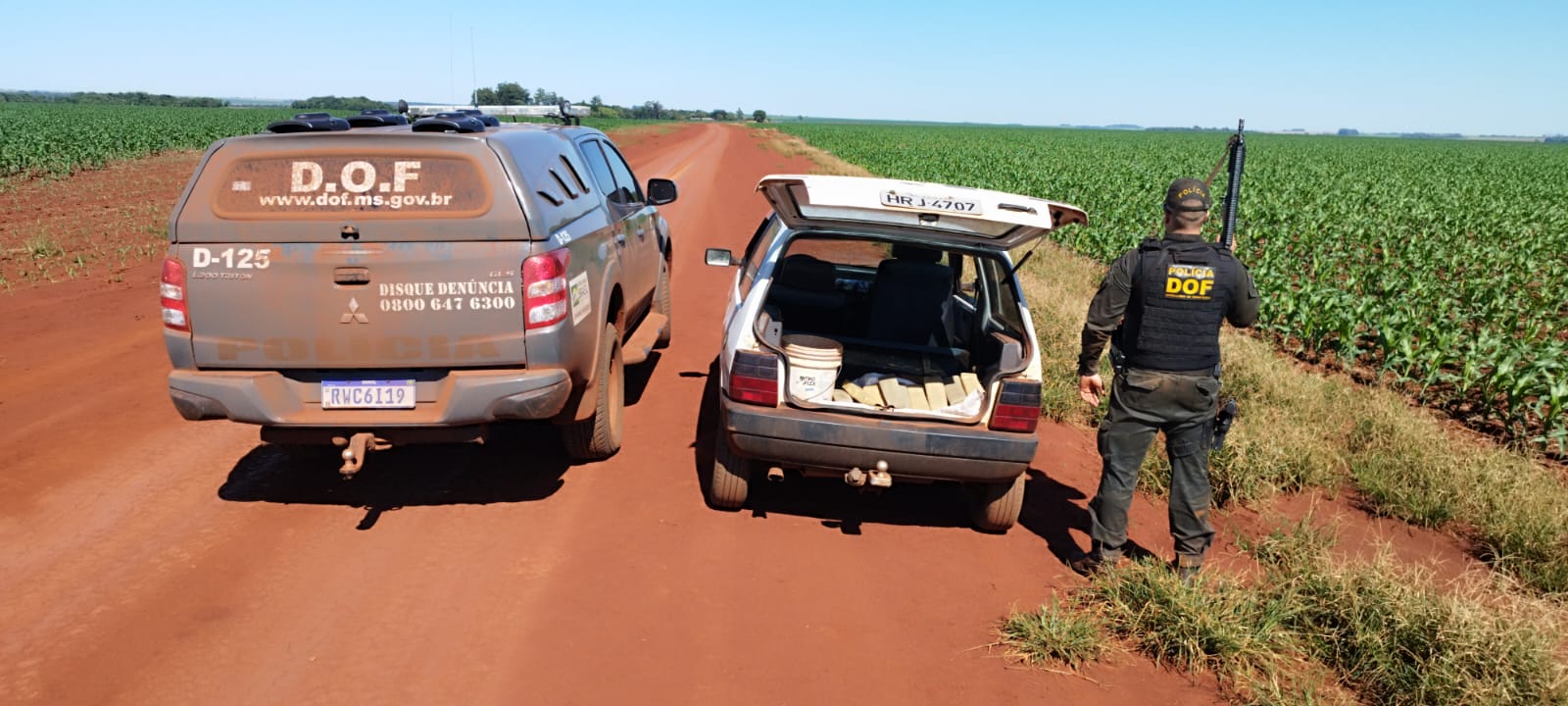 Os militares realizavam um patrulhamento rural da Operação Hórus, no município de Laguna Carapã, quando abordaram o condutor do veículo Fiat Uno de cor branca. Durante a checagem de rotina, dos dados pessoais para averiguação, localizaram-se dois registros criminais por tráfico de drogas.