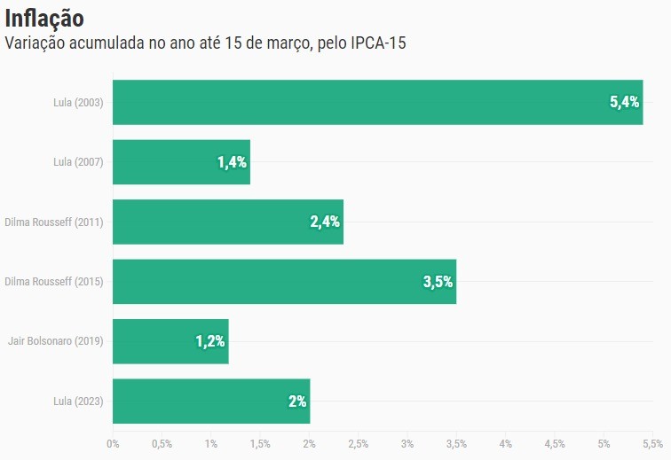 Lula, por outro lado, entregou um IPCA-15 acumulado em 5,4% até março de 2003, no primeiro mandato do petista.