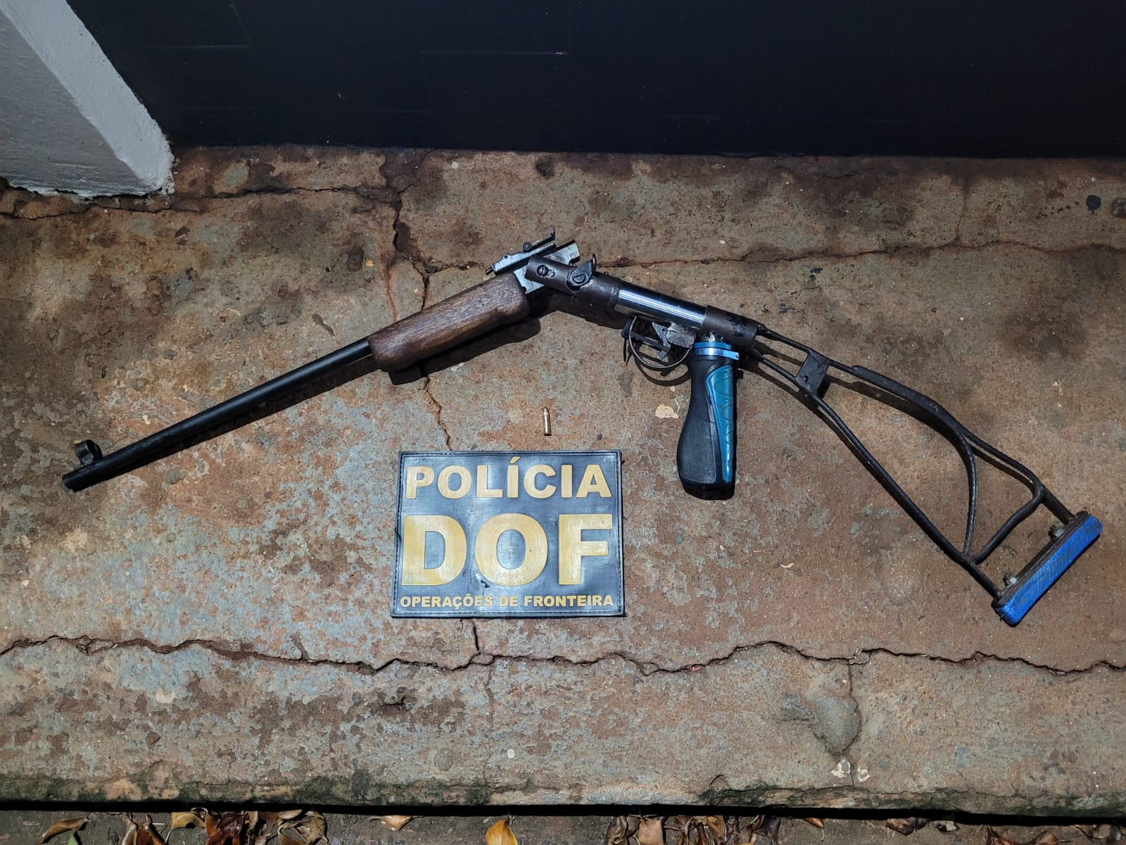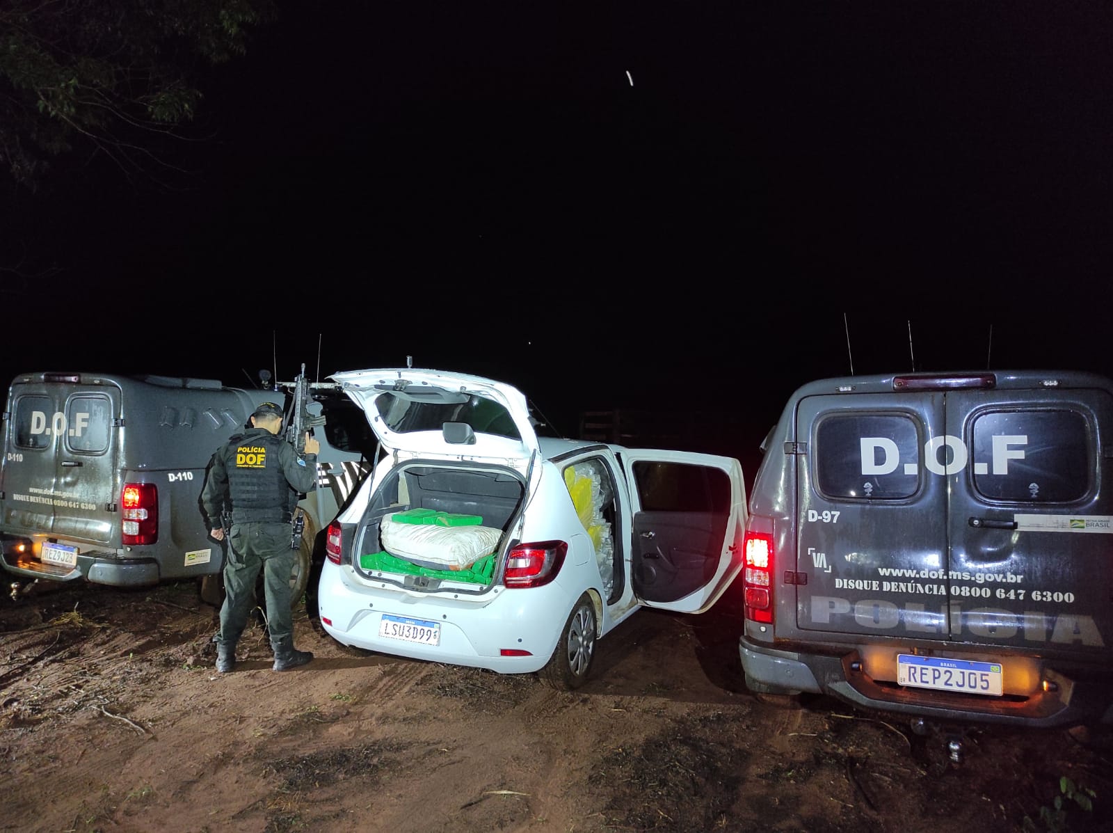Ao chegarem no local, duas equipes do DOF visualizaram algumas pessoas correndo para a mata próxima. Um homem foi alcançado e detido. Na residência os militares localizaram o veículo com o entorpecente, com total de 335,7 quilos de drogas, e uma arma de fogo tipo rifle artesanal sem numeração, de calibre .22 com uma munição intacta.